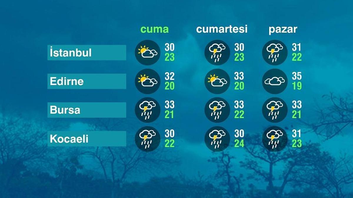 Marmara Bölgesinde parçalı bulutlu ve yer yer yağışlı bir hava hakim. Gündüz sıcaklıkları bölgede 30 ile 35 derece aralığında ölçülüyor. Cumartesi günü de benzer bir hava durumu bekleniyor.